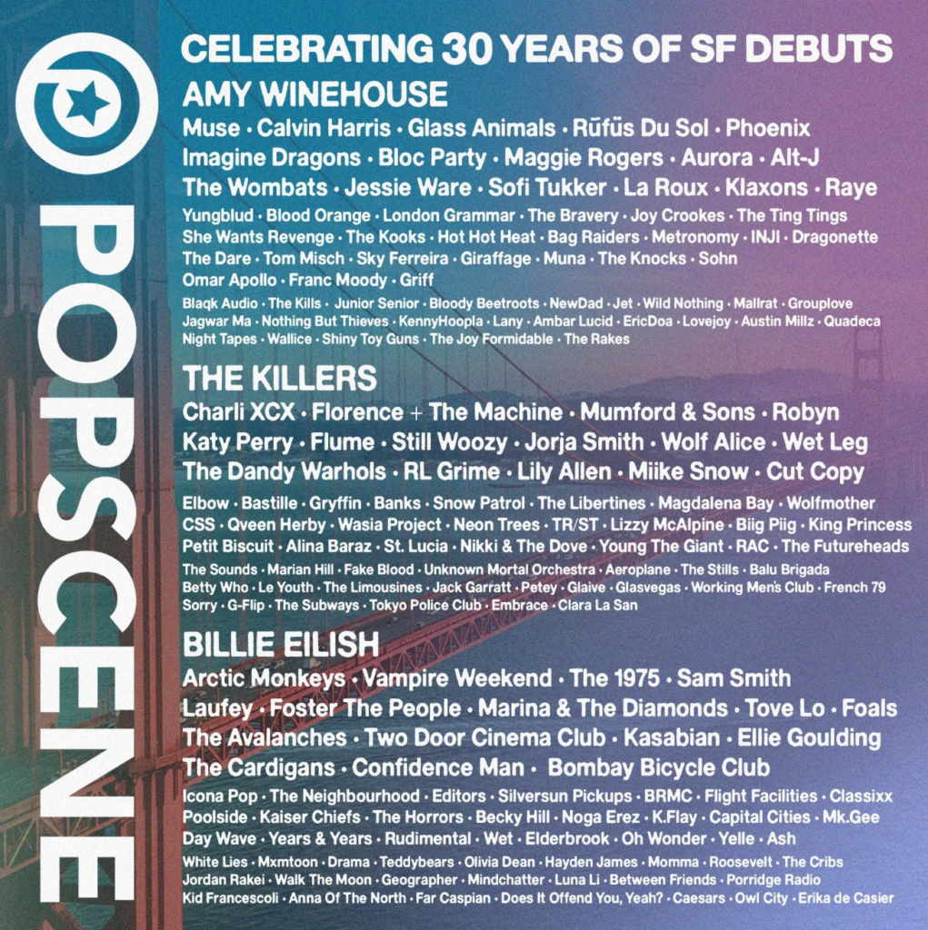 When you’re in the room, Popscene maestro DJ Aaron Axelsen makes it a point to project a Coachella-style poster on the wall of all the artists that made their SF debuts at this crucial indie party—at both Rickshaw Stop and the bygone 330 Ritch, Popscene’s home until 2010. It’s a head-turning list of names to get lost in. Billie Eilish, Arctic Monkeys, Blood Orange, Vampire Weekend, Florence + The Machine…heck there was a night in 2012 when Charli XCX headlined Rickshaw Stop with The Neighbourhood as her opener?! That’s just plain silly.