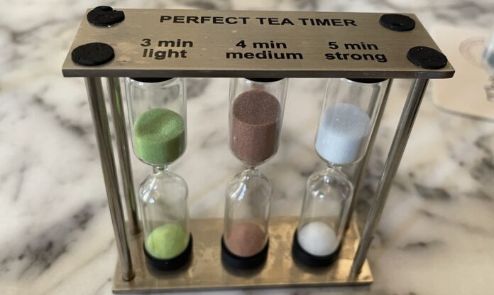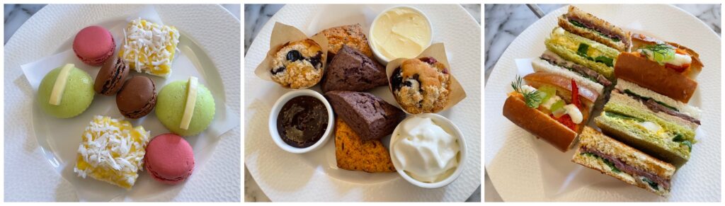 Bubbles and chocolate-covered strawberries signal the beginning of service. Teas from J’Enway, including an intriguing smoky Black Bacon Assam tea that is meat-free, are then wheeled out for sniffing and visual inspection before one makes their selection. A trio of tea timers allow sippers to control their own steep.
