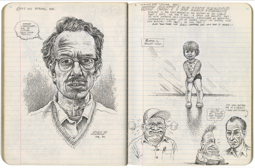 Throughout the biography, Nadel’s quotations from Crumb’s own letters to friends and from interviews suggest that the artist frequently has been offended by the behavior of other people: their acceptance of social conventions, conformity to social restraints, and his own temptation to conform lead him to deliver illustrated rants, verbal protests, and mocking portrayals of the offending parties.