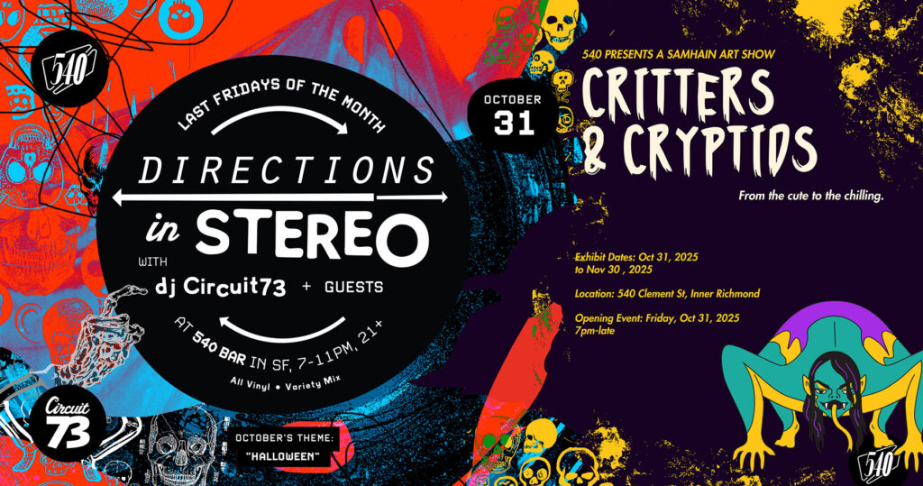 It’s a two-headed monster of sound and vision that lands on the last Friday of this month in the Outer Richmond. 540 Bar has curated a Samhain-themed art show that opens on this special evening. DJ Circuit73 will be contributing a piece as well as providing the howling sonic backdrop for the night. Guests on deck will bring all the ghoul-tastic audio treats that perfectly accompany the Pumpkin Spice Latte season.