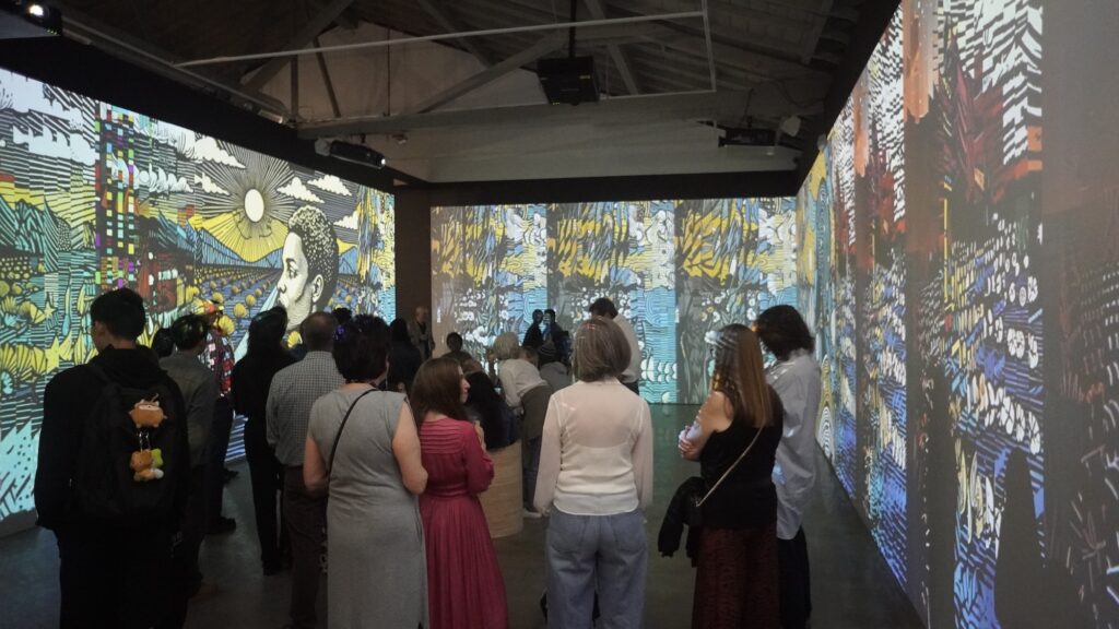 Moving from organic to digital systems, Dinkins presents her five-channel video installation “Data Trust” (2025) and the single-channel video “The Stories We Tell Our Machines” (2025). With data culled from Dinkins’ app, the artist uses her AI to sequence and represent the text, image, or audio stories that users have “gifted” her. Featuring imagery that centers Black communities, histories, and stories the work montages woodblock-like stylized imagery with bold curved lines, simplified shapes, and saturated-color graphics. As an AI work that will continue to evolve as new viewers contribute stories, the work’s discordant sequence embraces process, rather than verisimilitude and finished product.