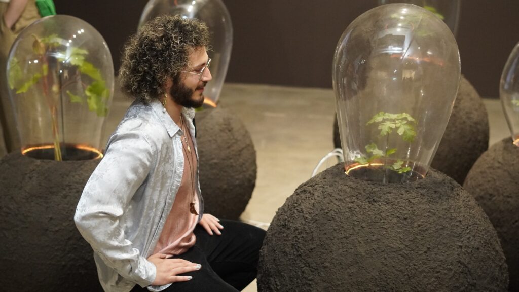 Towards the gallery entrance Dinkins frames story-telling through the many layers of cultural symbolism, history, and emerging bioscience. In “Data Trust: Living Archive” (2025), small okra plants and California black oak trees grow in a carefully designed biosphere of five soil encrusted orbs with blown-glass domes, all connected through an irrigation system. Underscoring this system of biological growth, the small okra plants and oak trees suggest ways that the pods and acorns nourished Black and Indigenous communities. Additionally, the plants and trees stand as cultural symbols that tell the stories of migration and resilience across geography and time.