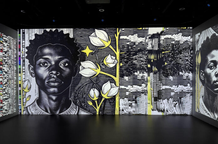 Moving from organic to digital systems, Dinkins presents her five-channel video installation “Data Trust” (2025) and the single-channel video “The Stories We Tell Our Machines” (2025). With data culled from Dinkins’ app, the artist uses her AI to sequence and represent the text, image, or audio stories that users have “gifted” her. Featuring imagery that centers Black communities, histories, and stories the work montages woodblock-like stylized imagery with bold curved lines, simplified shapes, and saturated-color graphics. As an AI work that will continue to evolve as new viewers contribute stories, the work’s discordant sequence embraces process, rather than verisimilitude and finished product.