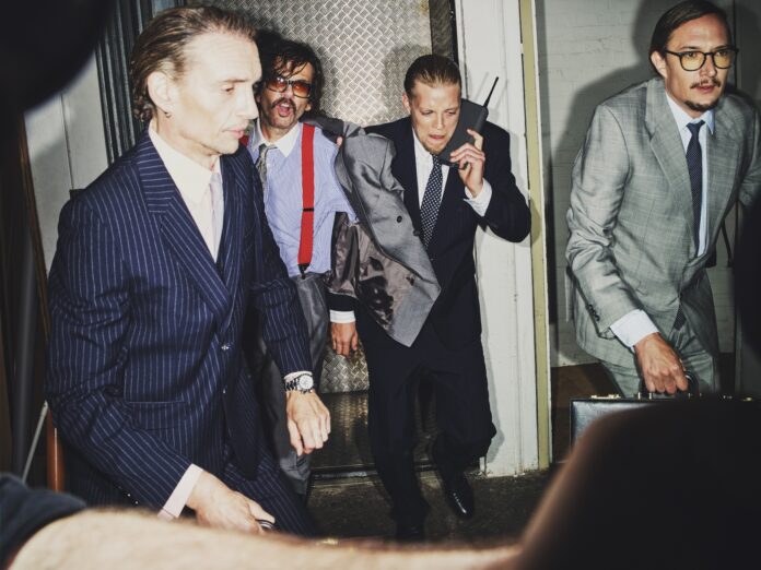 The album cover—designed by Grammy-nominated artist Perry Shall—only deepens the mystery with its tongue-in-cheek snapshot of band members appearing as high-flying executives in slick, sharp suits holding big ‘80s mobile phones, evoking yuppie excess and corporate swagger amid a backdrop of a glam-rock stage.