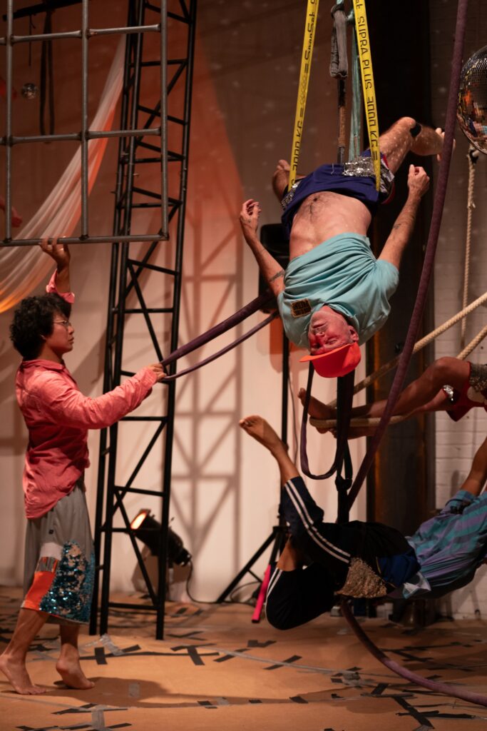 The set for weird inkling was a contrasting mix that found a bohemian-style tent in one corner, hanging metal scaffoldings swinging one way or another, at least four disco balls of various sizes hanging down, and even a makeshift hammock upstage. The floor was a crudely constructed cardboard tapestry held together by black electrical tape. Stage-right was a mound on the floor, as if a gopher were expected to pop out eventually. Upstage-left featured a three signs reading “FREE PALESTINE,” “figure it out,” and “FUCK ICE.” The audience members who didn’t sit in chairs sat around the perimeter of the three-quarter thrust on pillows or blankets.