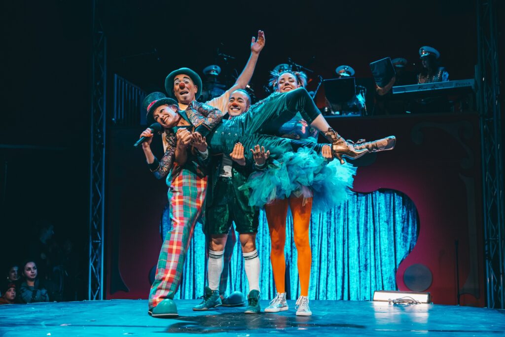 Yet, the opening night moment that stands out from watching the troupe’s new big tent show, Starlight (through January 4 at The Crossing at East Cut, SF), was one of the relatively “simpler” acts of the show. A woman was seated far-audience-left with her young son and seemed to not be enjoying herself. That is, until the second-half, when Circus Bella’s resident clown trio (Calvin Kai Ku, Jamie Coventry, and Natasha Kaluza) put one of their between-set slapstick routines. This one involved a rope-length piece of string that changed sizes several times, as well as finding its way into one clown’s pants.