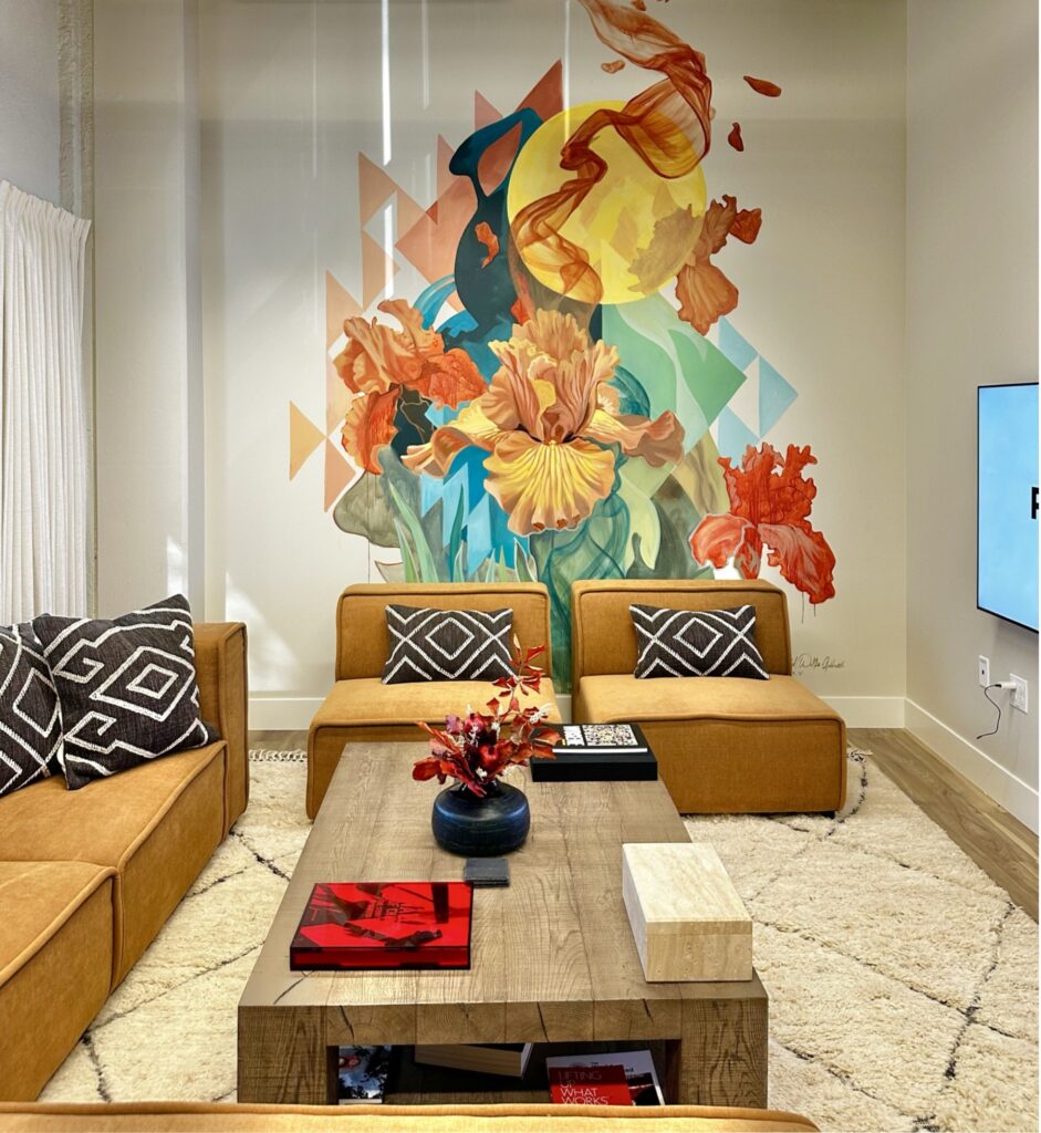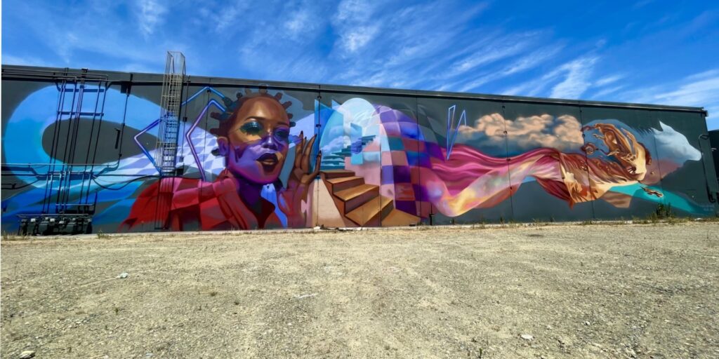 Wolfe-Goldsmith’s subject matter centers around the human form, which she describes as sometimes fragmented, sometimes whole, and set against abstract, architectural, or organic elements. Working with palette knives, big brushes, drips, and transparent layers, Wolfe-Goldsmith brings her characters and scenes to life for murals that depict living “change-makers and world builders.” Weaving together images taken from both urban and natural settings, she even paints herself into the storyline at times.