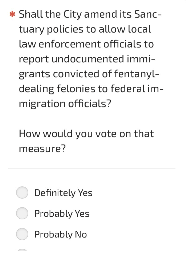 But San Francisco is adopting many of those approaches, and is moving away from harm reduction, and if polling I’m hearing about it true, there’s a move to scrap parts of the Sanctuary City Ordinance. Nato Green posted on Facebook a poll that is in the field, which includes the following: