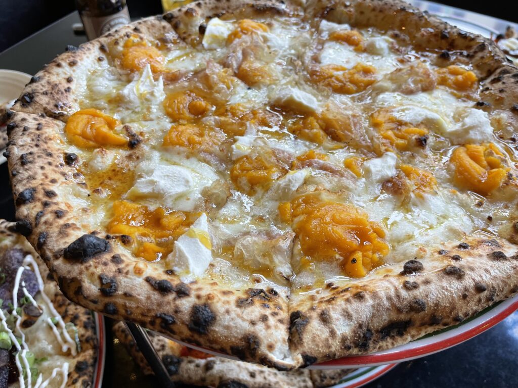Two of our favorites skew sweet and satisfy the craving for having some dessert vibes in the meal: I’m Your Huckleberry, a California pie that essentially comes off like a loaded baked blue potato, with crispy blues, huckleberry jam, green onion, mozzarella, sour cream, and huckleberry jam. We don’t get enough huckleberries in our Bay Area lives. There’s also the Napoletana style butternut squash with guanciale, which also has the Sorrentina provola cheese, mozzarella, sweet mascarpone, sorghum, and Maldon salt — it tastes like candy, and it’s wonderful.