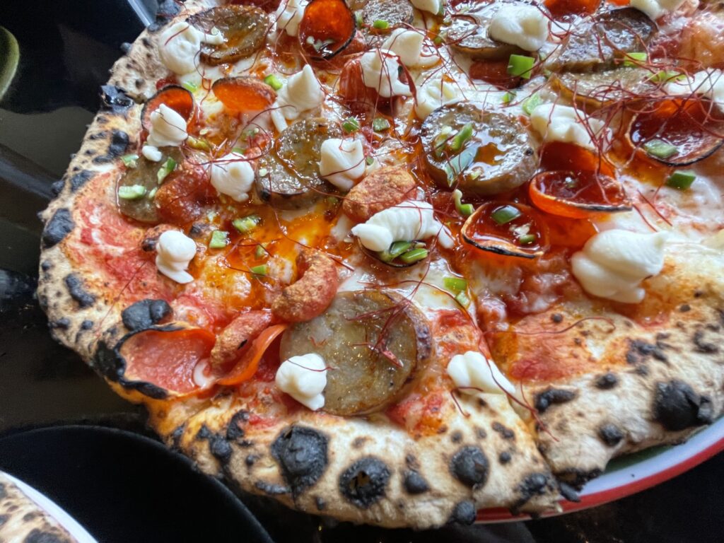 One of the new Napoletana styles is apt for the moment because it’s called Upside Down Anchovy. The dough is fried on both sides before it’s topped with tomato sauce, Sorrentina provola cheese, white and brown anchovies, pesto, Calabrian oregano and chili thread. It’s served with a pair of sharp pizza scissors for customers to cut their own proportions.