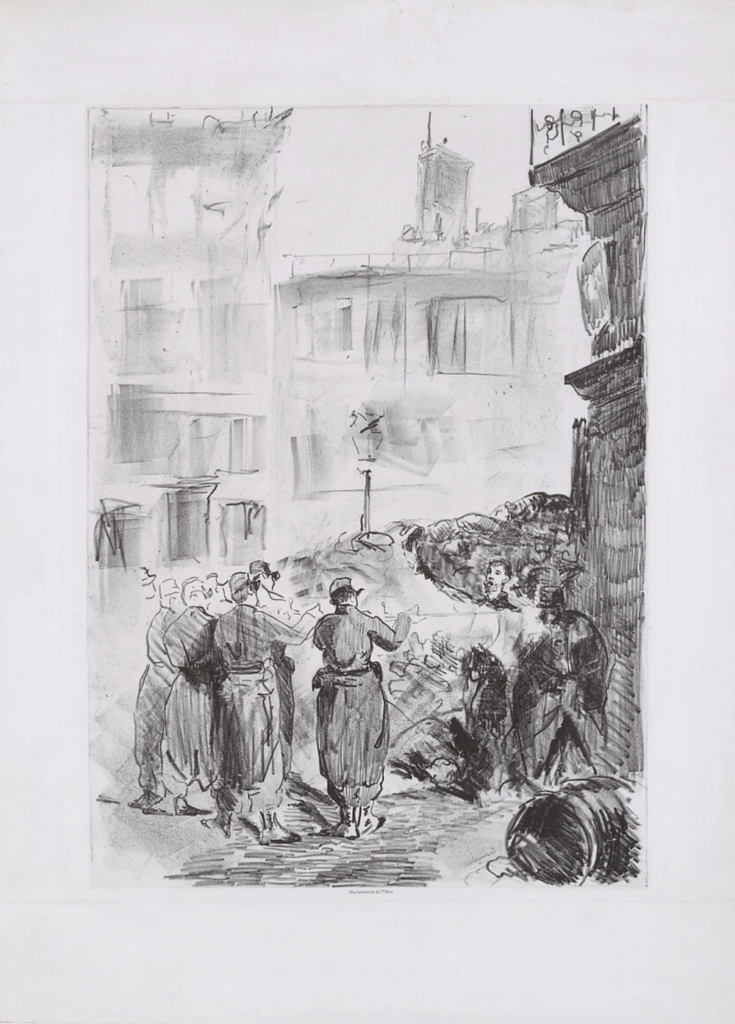 “The Berthe Morisot Brigade sent me this,” Alice acknowledged as I looked at the black-and-white depiction of a Paris barricade, “one of Manet’s responses to the defense and the destruction of the Commune. You won’t see this or its like on the Legion’s walls. They only show pastoral scenes.”