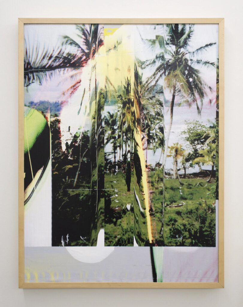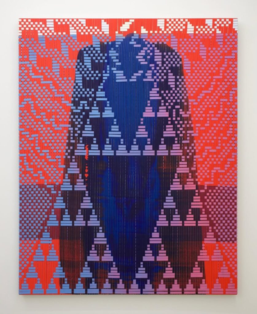 Next to “Coatl” is Bolivian-American artist Miguel Arzabe‘s 2024 “Entropía,” which continues the reference connection between digital and ancestral. Arzabe’s typical style straddles painting and weaving, threading strips of canvas through each other to create a 3-D picture plane calling back to the visual language of Andean textiles. Pale blue and pink-washed Atari-like pyramidal forms drape a cerulean, almost bonshō, form, which radiates zips and cursors against a volcanic orange. At first look, “Entropía” summons a strange eco-cultural future, another ulterior codex. But the title gives pause.