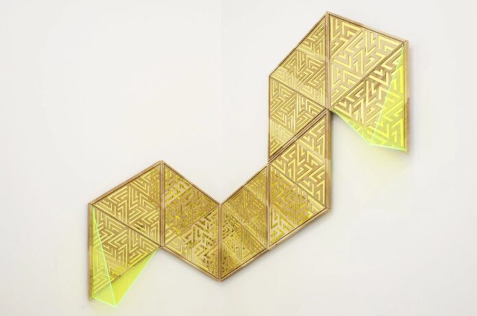 Ana Teresa Fernández’s ‘Coatl’ slithers around a corner of Romer Young Gallery in Dogpatch, bridging two walls with a hypnotic flash of angular gold metal glyphs, laser-inscribed into oaky wood, its ends jutting out in two ominous neon yellow plexiglass “fangs.” Viewers of a certain generation will immediately be put in mind of the once ubiquitous Rubik’s Snake, adding a level of nostalgic humor to the piece, while viewers of the generation before that might recall modular architecture and the retro-future blueprints of Buckminster Fuller.