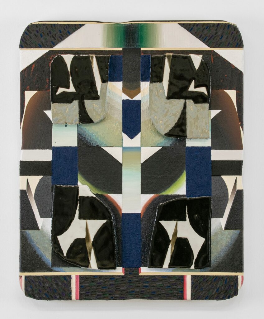 One of my favorite pieces in the show is called “Night Driving With Halo Around Lights and Increased Glare,” a 2025 painting by Salvadoran artist (and SFSU grad) Kevin Umaña. In many ways it’s a typical abstract painting, incorporating broken ceramic tiles into its bracing geometry, which contrasts thick black, white, blue, and brown lines with delicate green, orange, rose, and gray-blue luminosity. It invokes the glare of headlights while driving around on a drizzly evening, but Barrios-Recendez elaborates a deeper story.