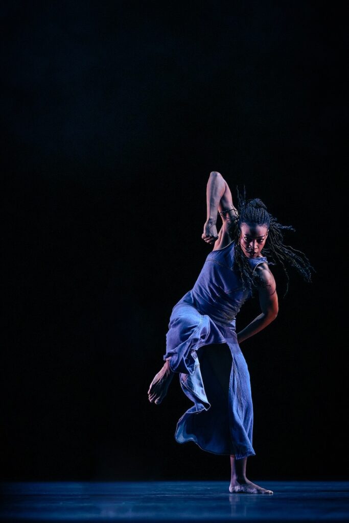 This dance began with the elegantly marvelous Lloyd Knight, soon joined by the work’s other six dancers. Costume designer Karen Young rendered the dancers’ loose trousers and tops in various shades of blue, from aqua to cerulean. The colors illuminated by Al Crawford’s sculptural lighting were instantly uplifting, the choreography suggestive of hope. While short sections offered enticing demonstration of how these dancers can shift in a blink from peaceful to pained, the sum was slightly less impressive than the parts. Perhaps Boykin can add to the work.