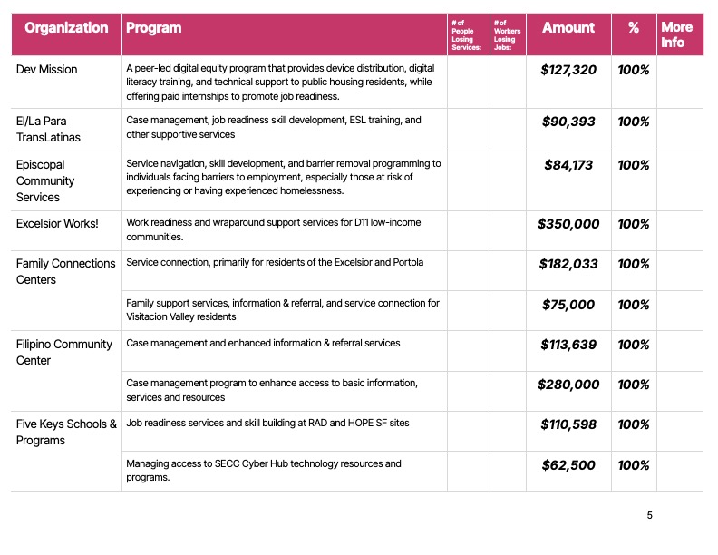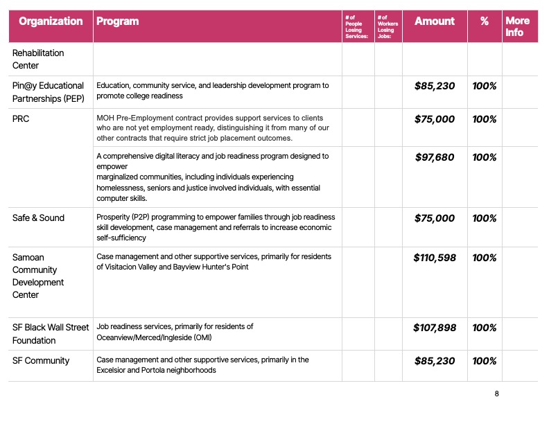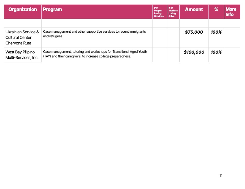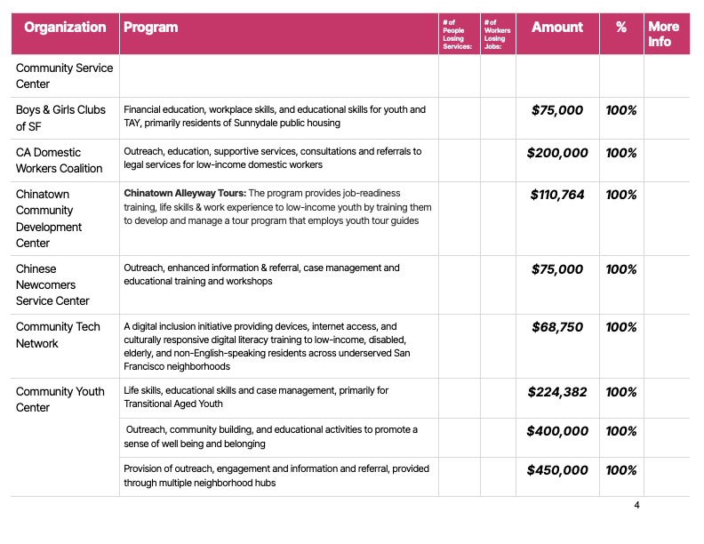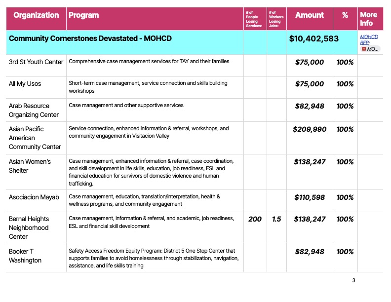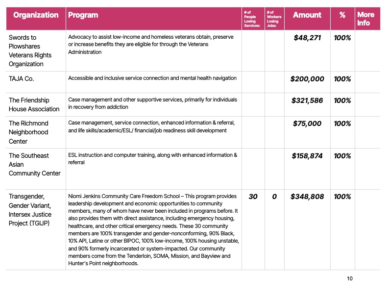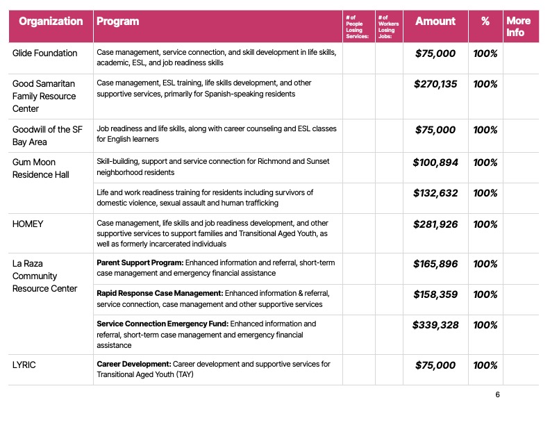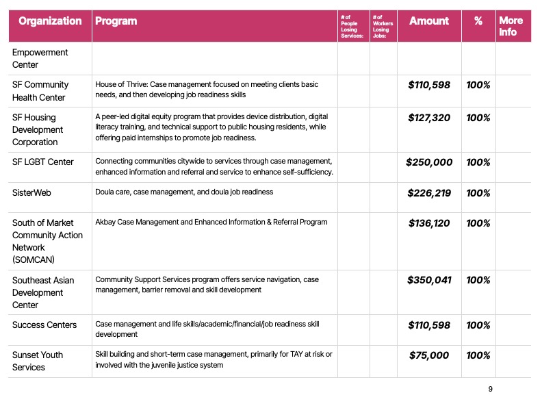 Some organizations, like All My Usos, which works with under-resourced Pacific Islander communities, and HOMEY, which works with youth, including Transitional Age Youth, and families in the Mission, may have to shut down.