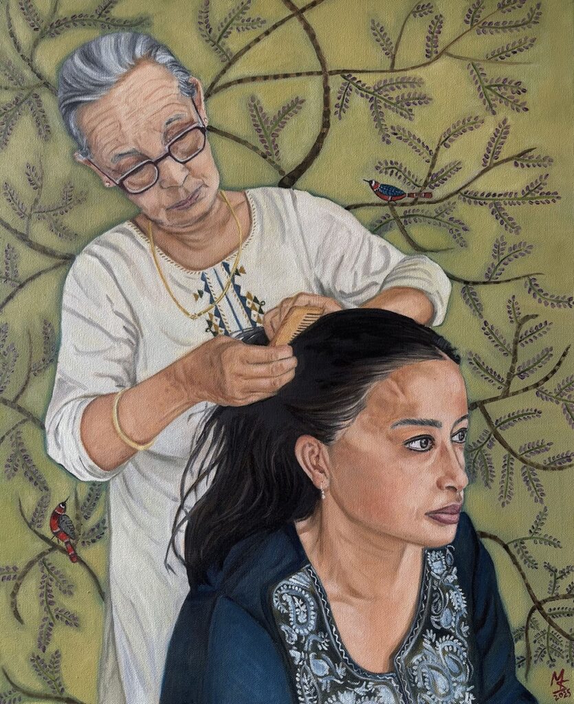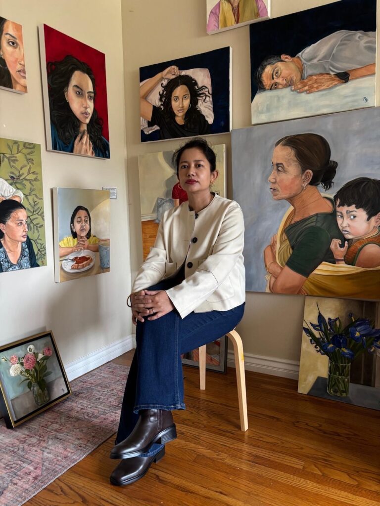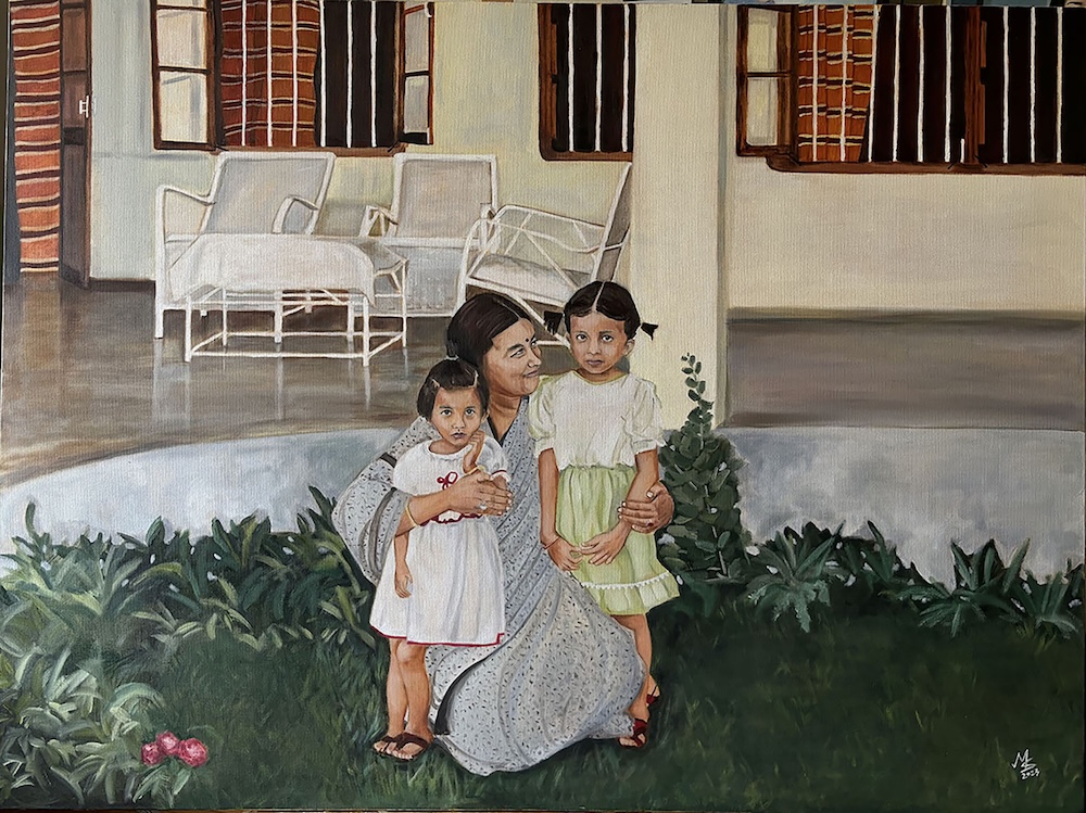 Sharma’s painting Memory is an example of capturing and preserving a moment from her childhood. It portrays the artist with her sister and mother in front of the house where she grew up. And while she has a strong passion for portraiture, she doesn’t put herself in a box. Sharma also creates still lifes and more complex narrative works.