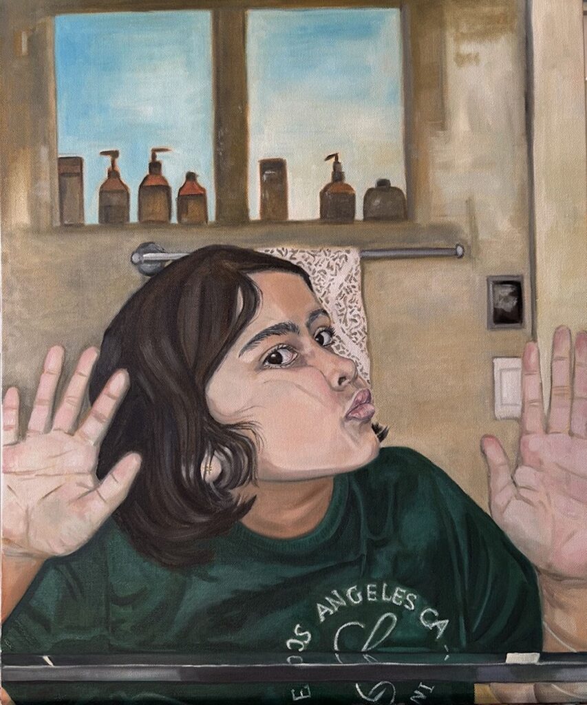 Her painting Let Me In is a tender reflection of these sentiments in a depiction of her daughter pressed eagerly against a glass door, her face full of curiosity and wonder.