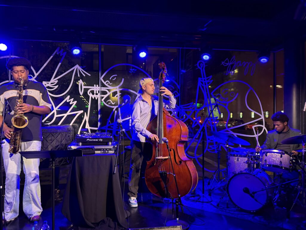 The trio is outfitted with Abdias Armenteros on tenor and soprano sax, the youngest member of the Jazz at Lincoln Center Orchestra. Bassist Sebastian Rios, also Miami-born, is the most outspoken and charismatic member of the group—he’s a 2024 ASCAP Herb Alpert Young Jazz Composer Award-winner. And the very understated Jacksonville-raised drummer TJ Reddick, who most of the night was looking outside at traffic running down Franklin, while keeping impeccable timing, with the lightest of touches, has become a presence of interest among stellar young trap players, working constantly in top New York clubs.