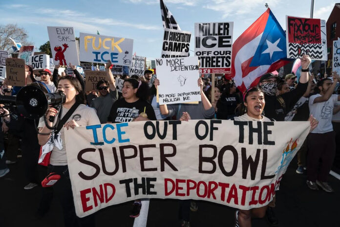 48 Hills teamed up with El Tecolote and URL Media to capture the scene around the Super Bowl in Santa Clara. Fierce protest spirit melded with a love of music, as activists handed out ICE OUT towels and hundreds marched against ICE outside the stadium, while inside (and out) Puerto Rican performer Bad Bunny infused the big game with a huge dose of Latin culture and bass. Below are some of our videos and posts.