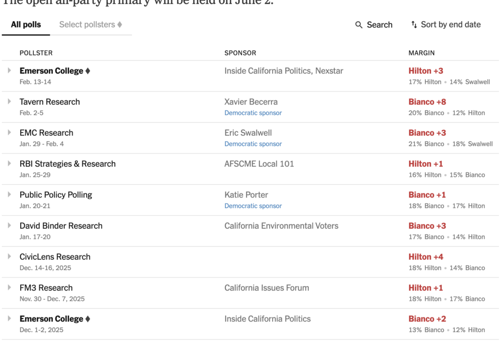 If the election were held today, most of the polls show, two Republicans would top the field, and no Democrat would be on the November ballot. That’s simple math: Two GOP candidates splitting the 25 percent of the Republican vote, and eight Democrats splitting the 45 percent of the Democratic vote.