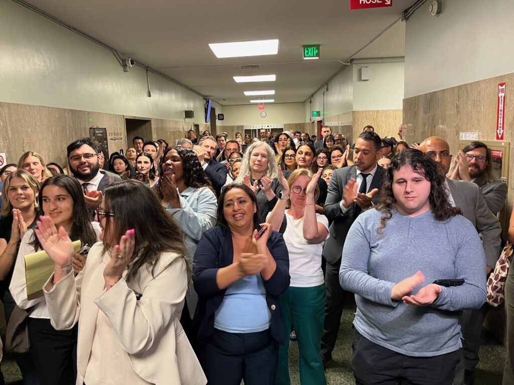 Public defenders from seven California counties stood with Raju before the hearing, and argued that legal ethics and constitutional law require attorneys to have the training—and capacity—to aggressively represent their clients.