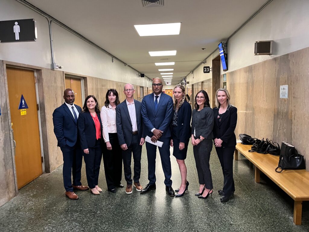 Chief public defenders from nine different counties showed their support for San Francisco Public Defender Mano Raju today in court. Alameda Chief Brendon Woods, Contra Costa Chief Ellen McDonnell, Yolo Chief Tracie Olson, and Sonoma Chief Brian Morris to the left of Raju, and Santa Cruz Chief Heather Rogers, San Joaquin Chief Judyanne Vallado, Sacramento Chief Amanda Benson to the right of Raju. Marin Chief David Sutton and Napa Chief Kris Keeley are not pictured.
