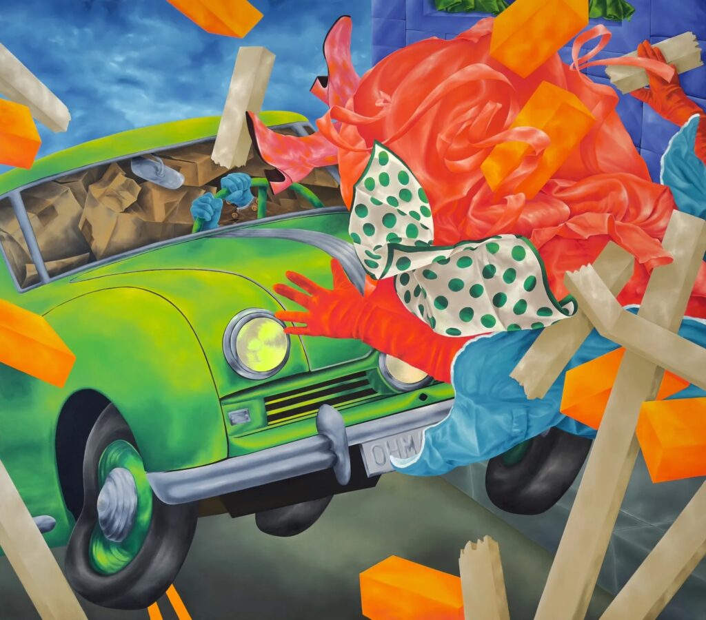 “With the painting that was next to the stairs, the ‘large pants painting’ [Trouble], I wanted you to be able to stand under it and look up at the person and feel overwhelmed. And I wanted the painting of the car crash [Ooooh Mama!] to sort of feel like it’s coming at you and it’s going to hit you,” she said. “It felt a lot more claustrophobic while I was painting it. And that feeling of claustrophobia and actual danger, like the painting might fall on you, is important to me.”
