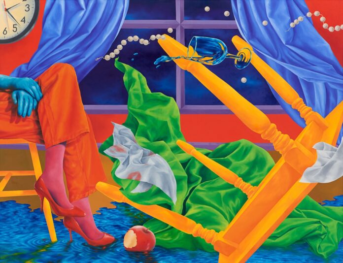 In the uncannily off-kilter paintings in Rachel Simon Marino’s inaugural solo exhibition at San Francisco’s Berggruen Gallery Running on Air (through April 30), pearl necklaces break, spilled wine flies through the air, doors lead to doors that lead to windows. Her work seems both totally original and familiar at the same time.