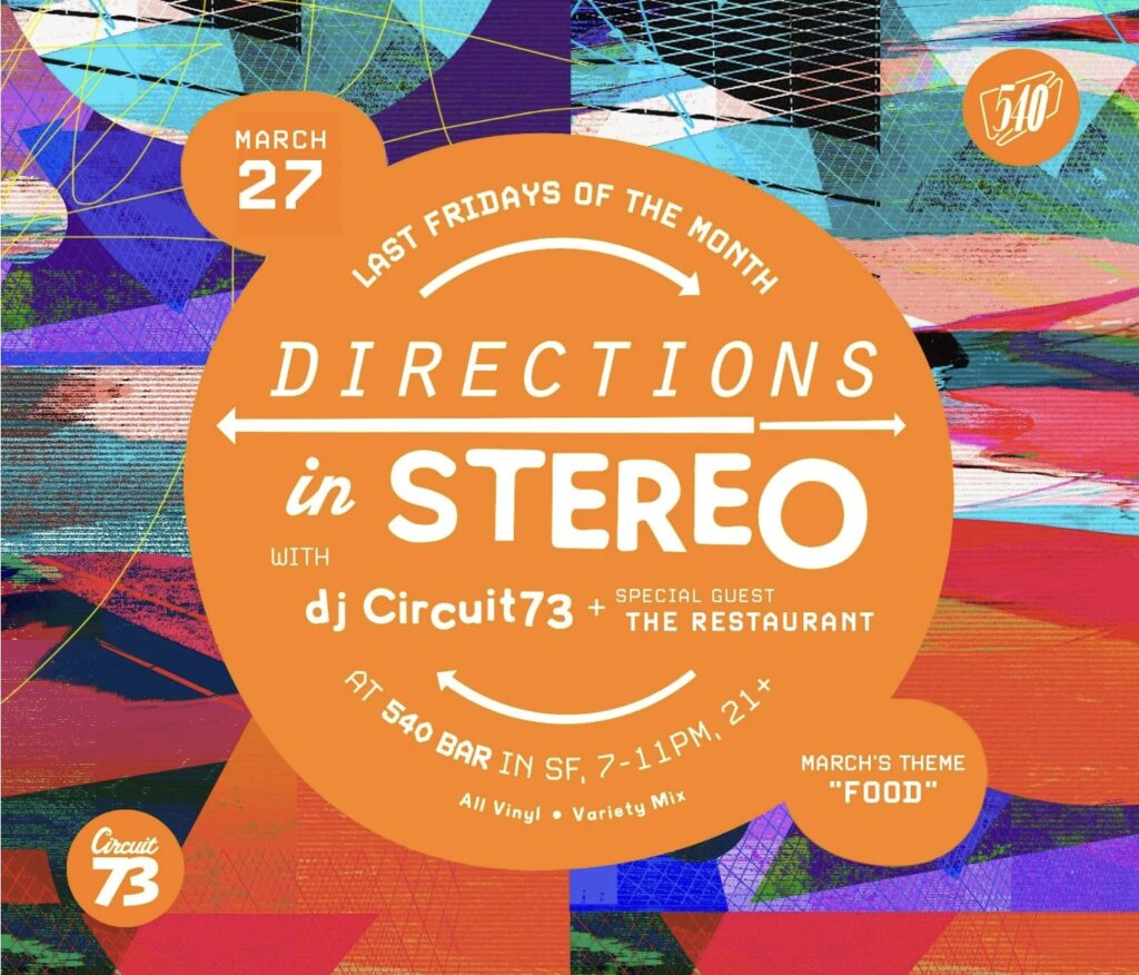 Join resident Resident DJ Circuit73 and special guest The Restaurant on the last Friday of the month at 540 Bar as the Directions In Stereo party cues up an eclectic, sonic backdrop for the evening focused on food. Still guaranteed to be an all-vinyl variety mix to the max. Expect songs about food and its adjacent topics: A smorgasbord of aromatic grooves and greasy licks. Expect deep-fried funk, simmering soul, sautéed jazz, seared rock, mashed pop, baked reggae, roasted disco, and everything in between, spanning all eras past and present, a Bon appétit buffet.