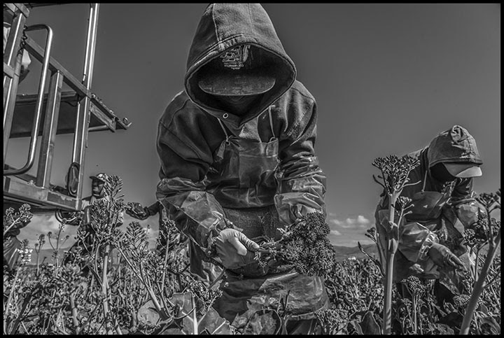 Walking and joking among the workers, I began to take photographs that would show the way they worked. When I made my corny joke that I’d only take photos of the mas guapo, the handsomest ones, Daniel, Ignacio and Felix all pointed to each other, laughing. Of course we couldn’t tell who the good-looking guys were, since they were all masked with bandannas. Everyone wore long plastic aprons to keep their clothes dry in a very wet field, even Daphne, working up on the moving platform.