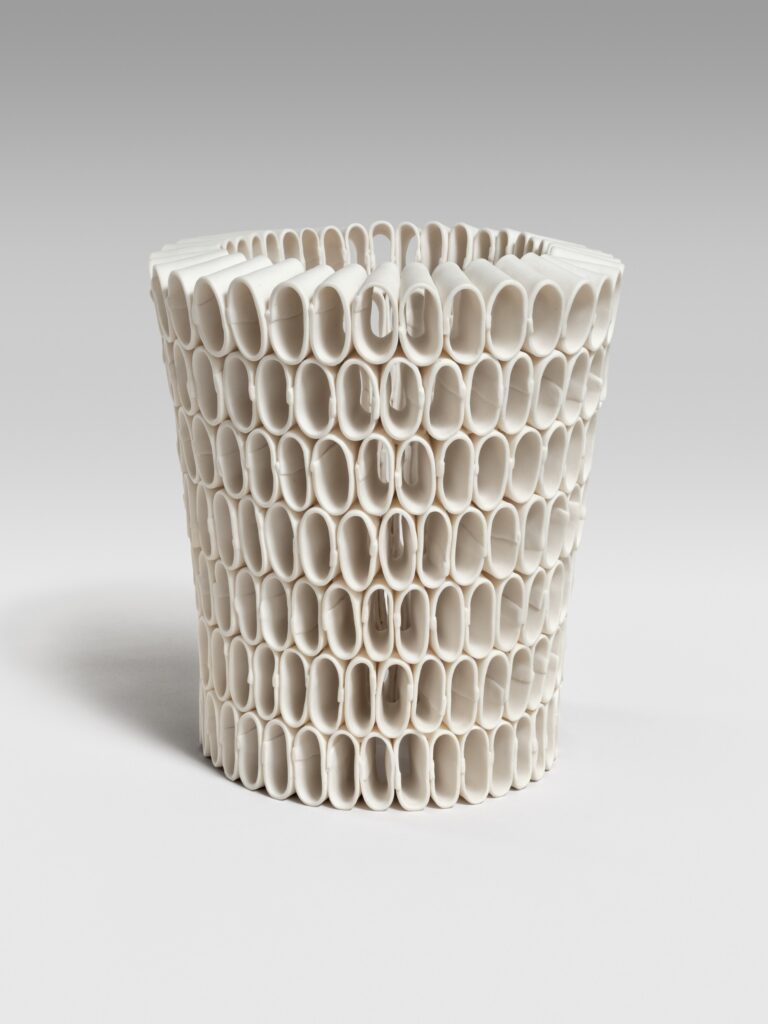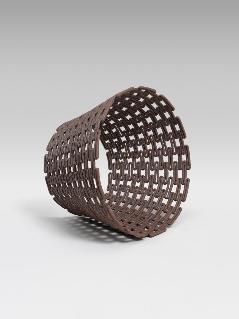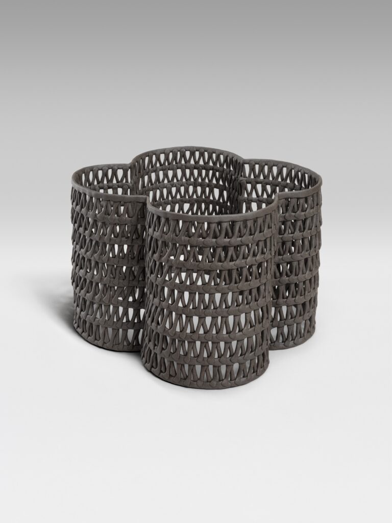 Considering pattern as her visual language, Gabriel feels obsessed with light and shadow, exploring forms that feel “simultaneously contained and porous.” She describes her open-ended pieces, Ripple and Aspen Brick, as works that function like skins that hold negative space while exploring fragility and translucency.