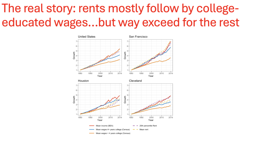 Storper, again using data, pointed out that even in the most optimistic scenarios, removing all constraints to development might bring prices down to the level that an average working family can afford—in 50 years or more. Developers, he said, have no incentive to flood the market with lots of new housing; if prices go down, the developers lose money.